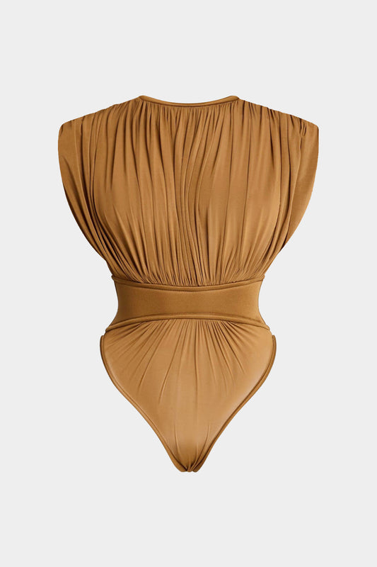 Zipper Ruched Waist-Cinching Round Neck Bodysuit