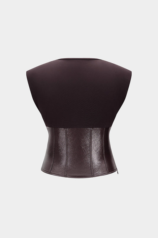 Faux Leather Round Neck Patchwork Short Sleeve T-Shirt