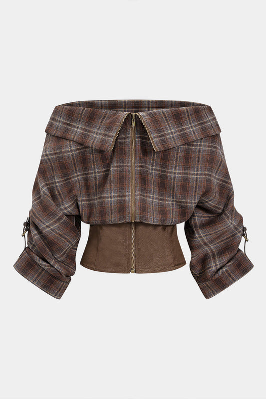 Plaid Print Satin Patchwork Off Shoulder Zipper Long-Sleeve Shirt