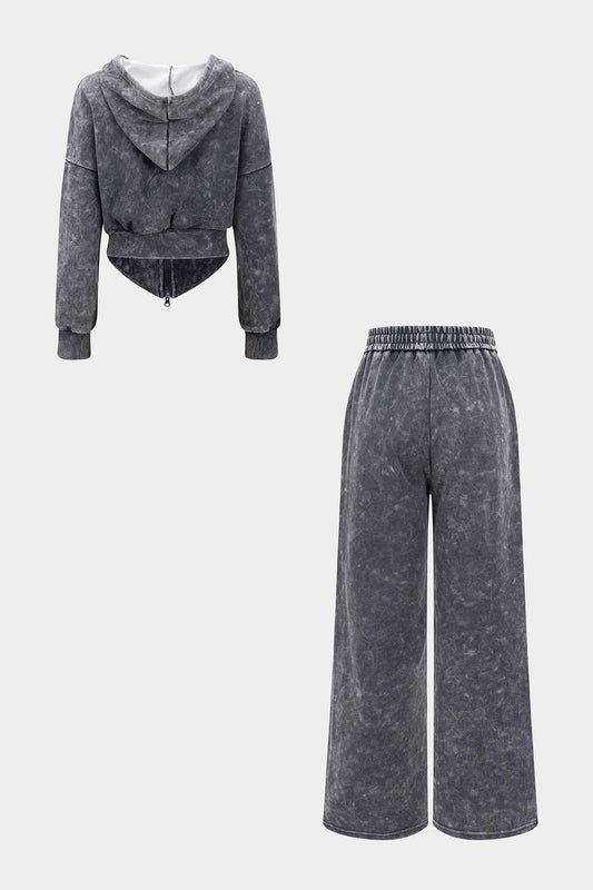 Drawstring Zipper Hoodie And Shirred Waistband Trousers Set
