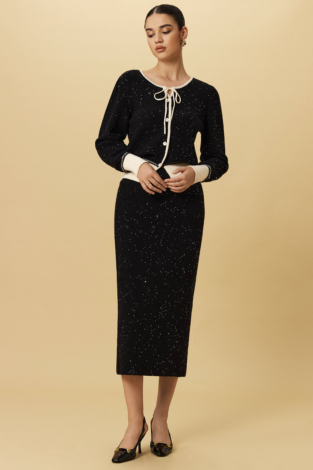 Knit Contrast Button Tie-Up Long-Sleeve Top
