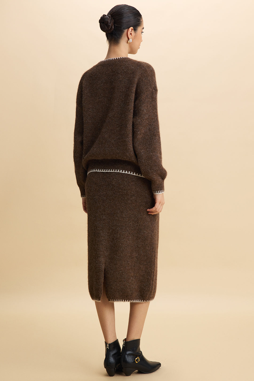Knit Contrast Whipstitching Long-Sleeve Top And Skirt Set