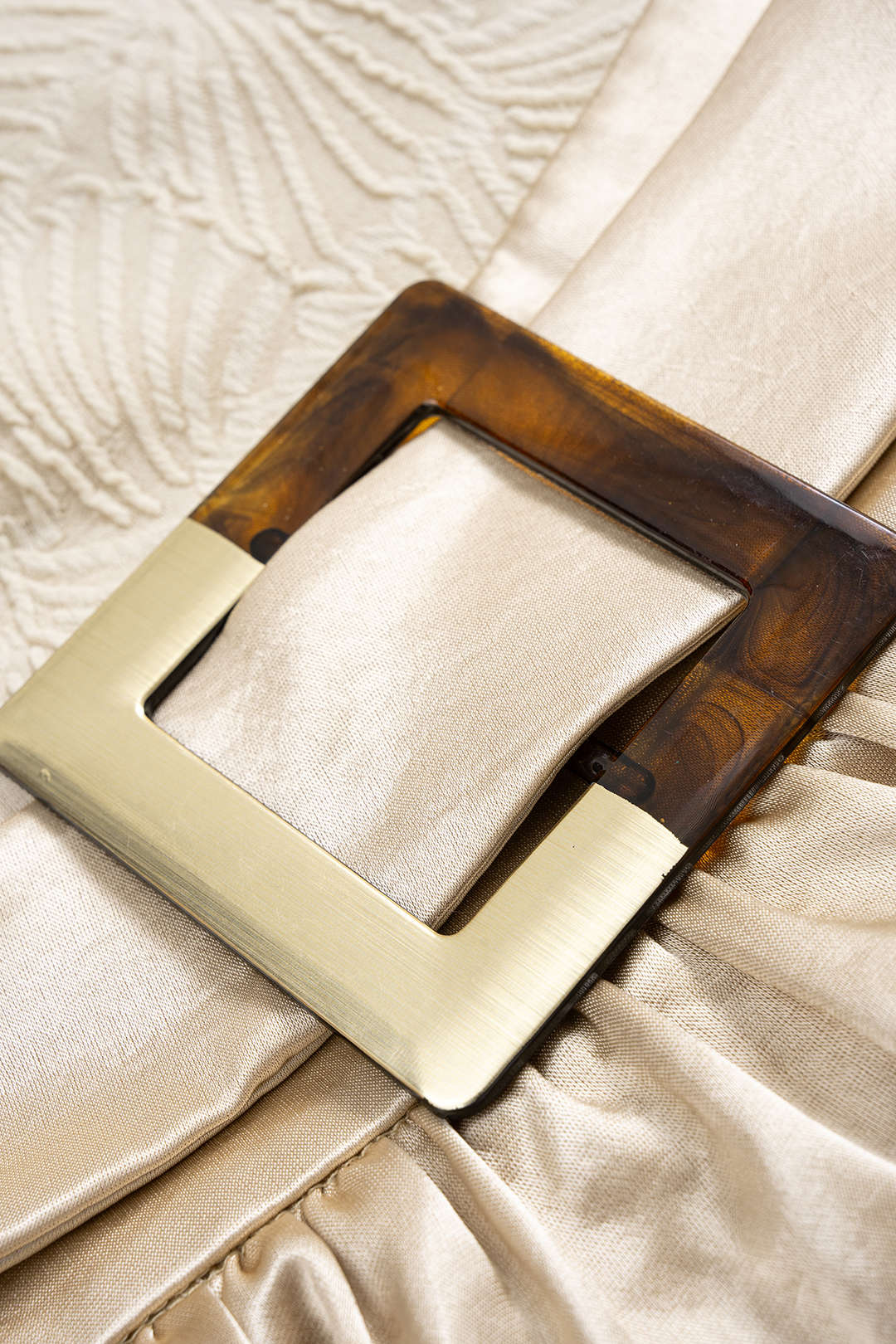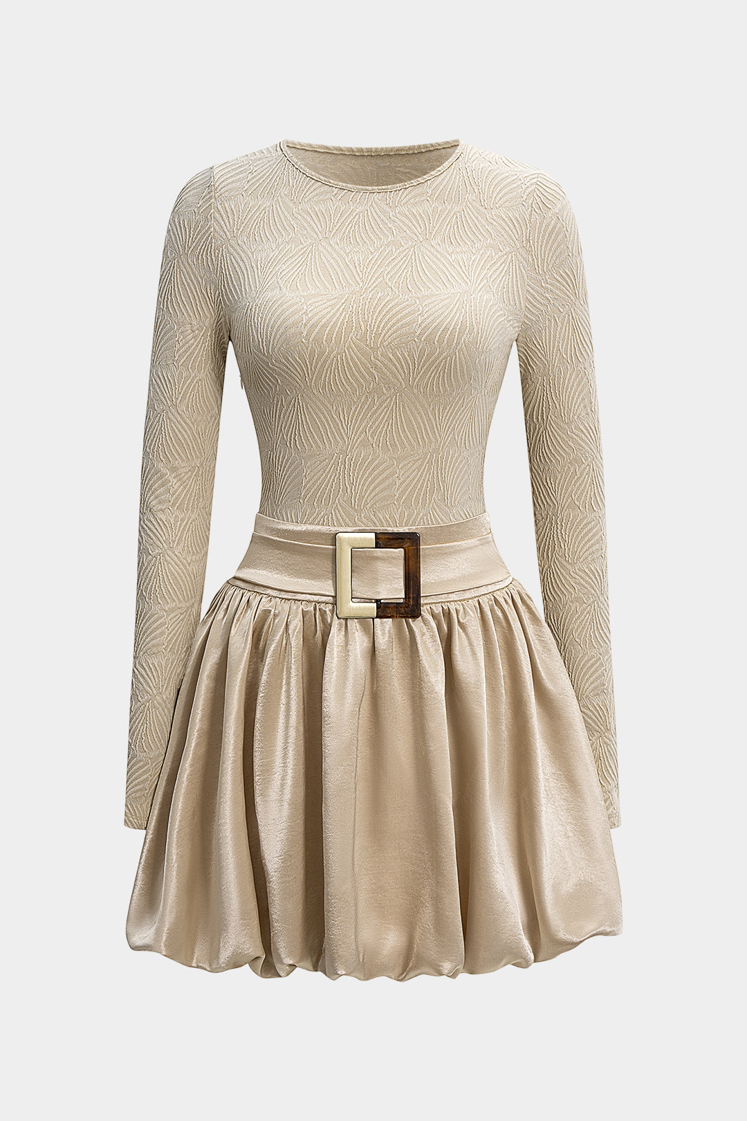 Satin Round Neck Ruched Belted Long Sleeve Mini Dress
